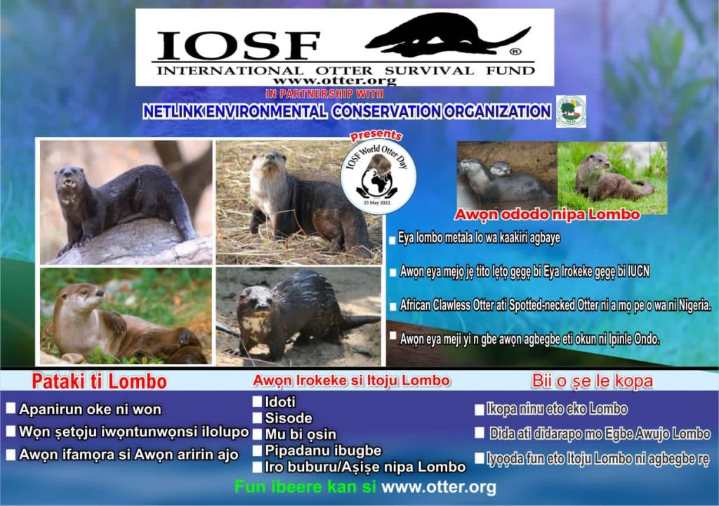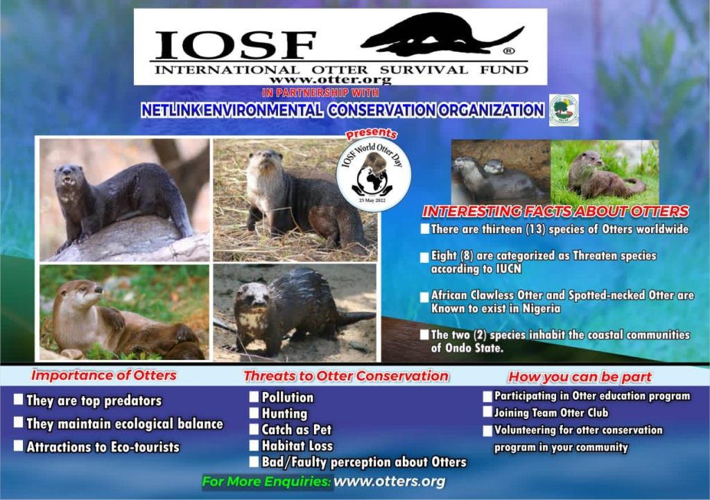 Ondo State’s rich and highly diverse aquatic resources are declining due to impact of climate change and unsustainable exploitation. The two species of otters inhabiting the riverine communities of Ondo State are decreasing on a daily basis as a result of illegal hunting, water pollutions, habitat fragmentation/loss and faulty or bad perceptions. Thus, conservation of spotted-necked otter (Hydrictis maculicollis) and African clawless otter (Aonyx capensis) in their natural habitat is of high priority wherever they occur to ensure their survival. It is therefore vital to sensitize/educate individuals on the importance of otters and the protection of their habitat.